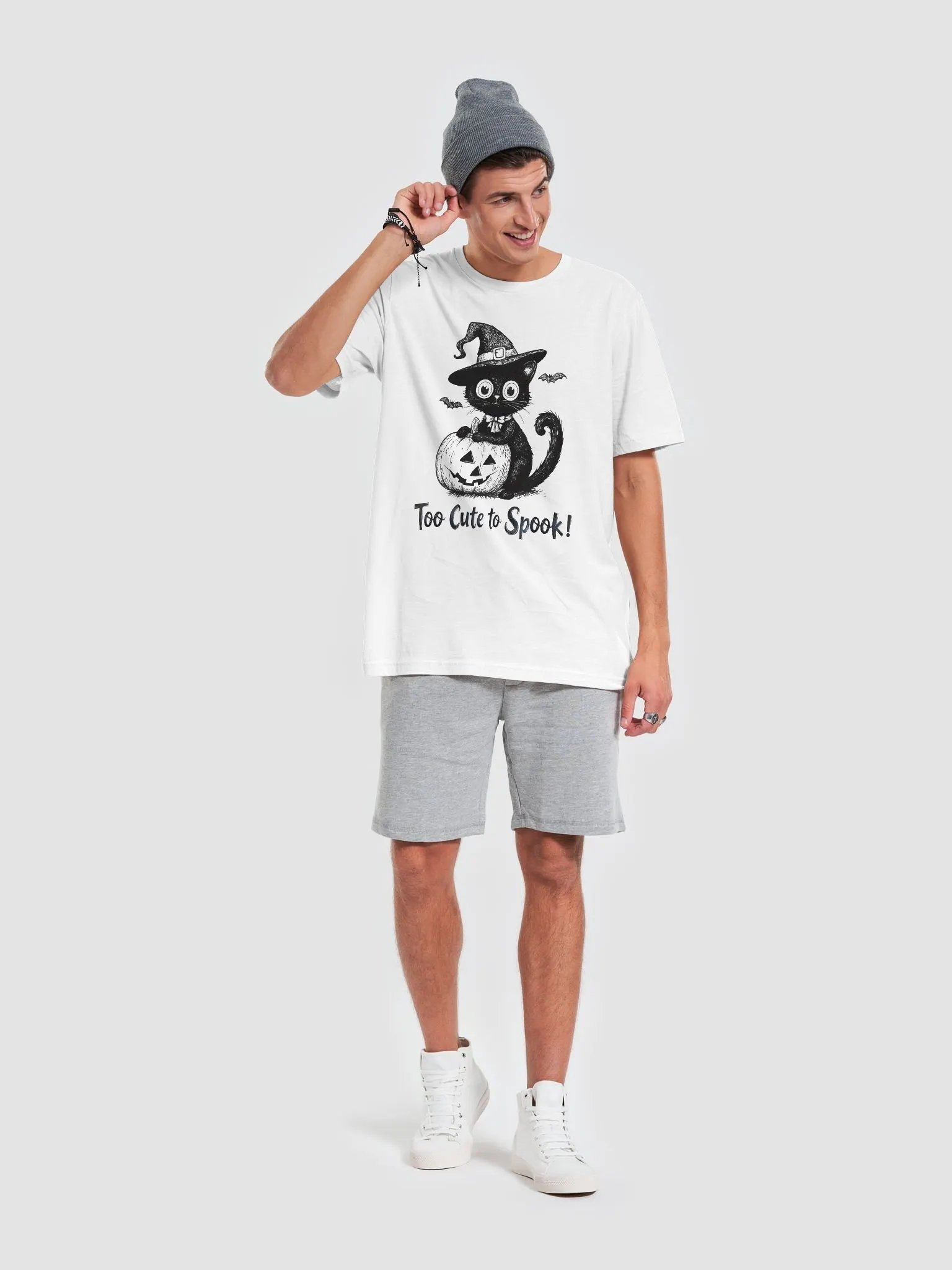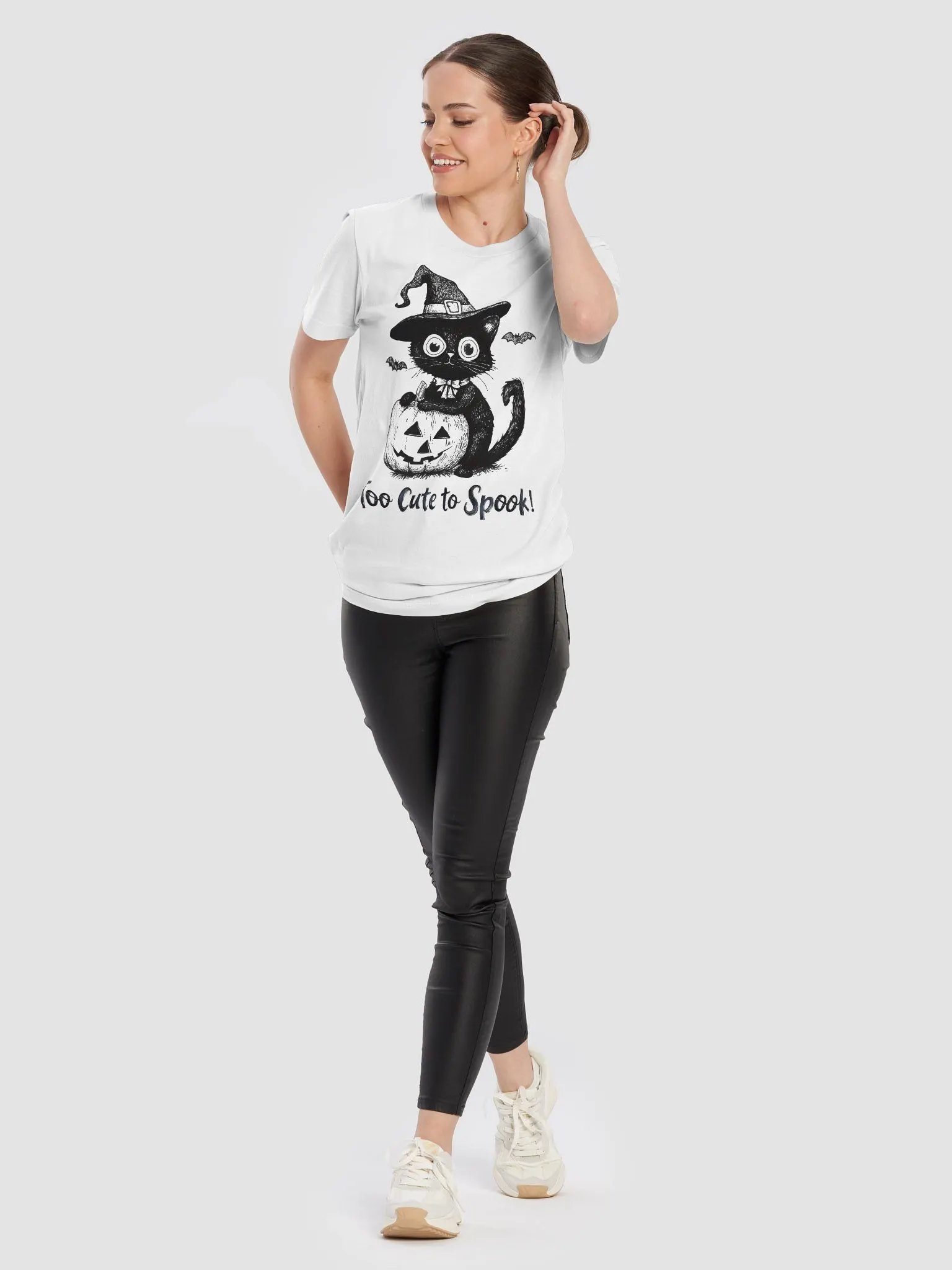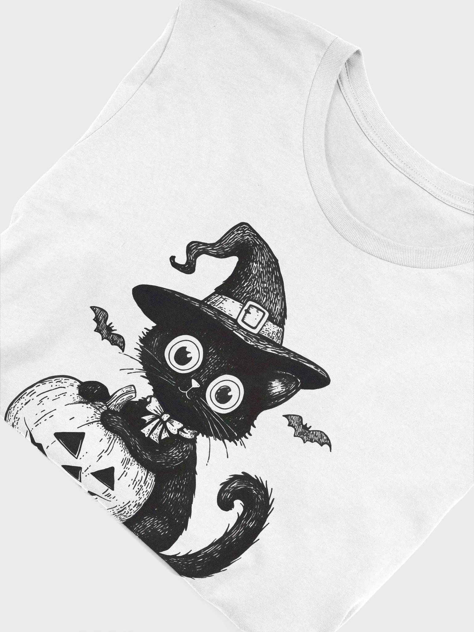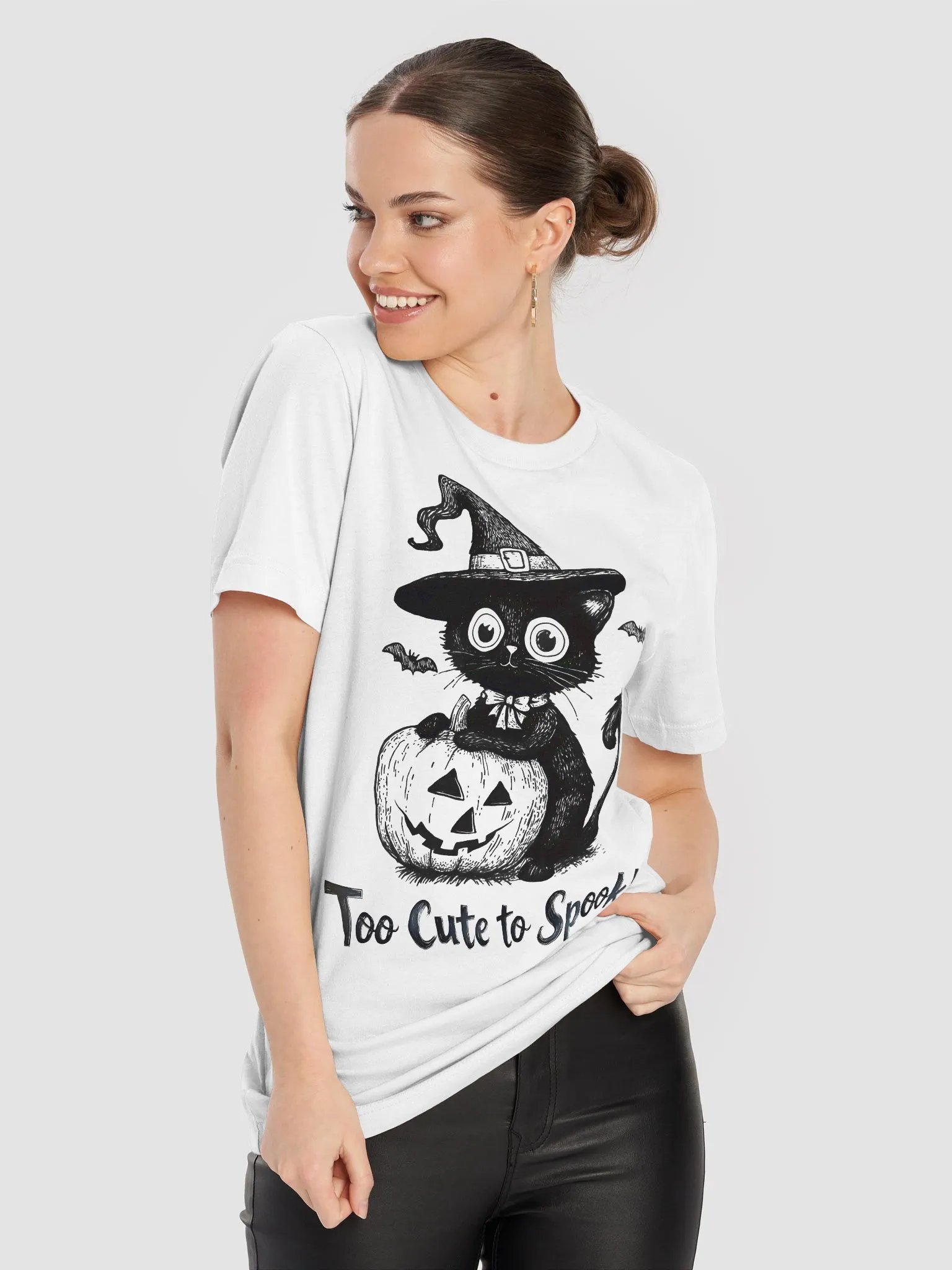 Embrace the spooky season with this "Too Cute to Spook" Halloween T-shirt! Featuring an adorable black cat wearing a witch's hat and sitting on a jack-o'-lantern, this design adds a touch of cuteness to your Halloween festivities. Perfect for cat lovers or anyone who wants to add a playful, spooky twist to their Halloween wardrobe. Made from soft, comfortable fabric, this Bella+Canvas T-shirt is a must-have for your Halloween collection.